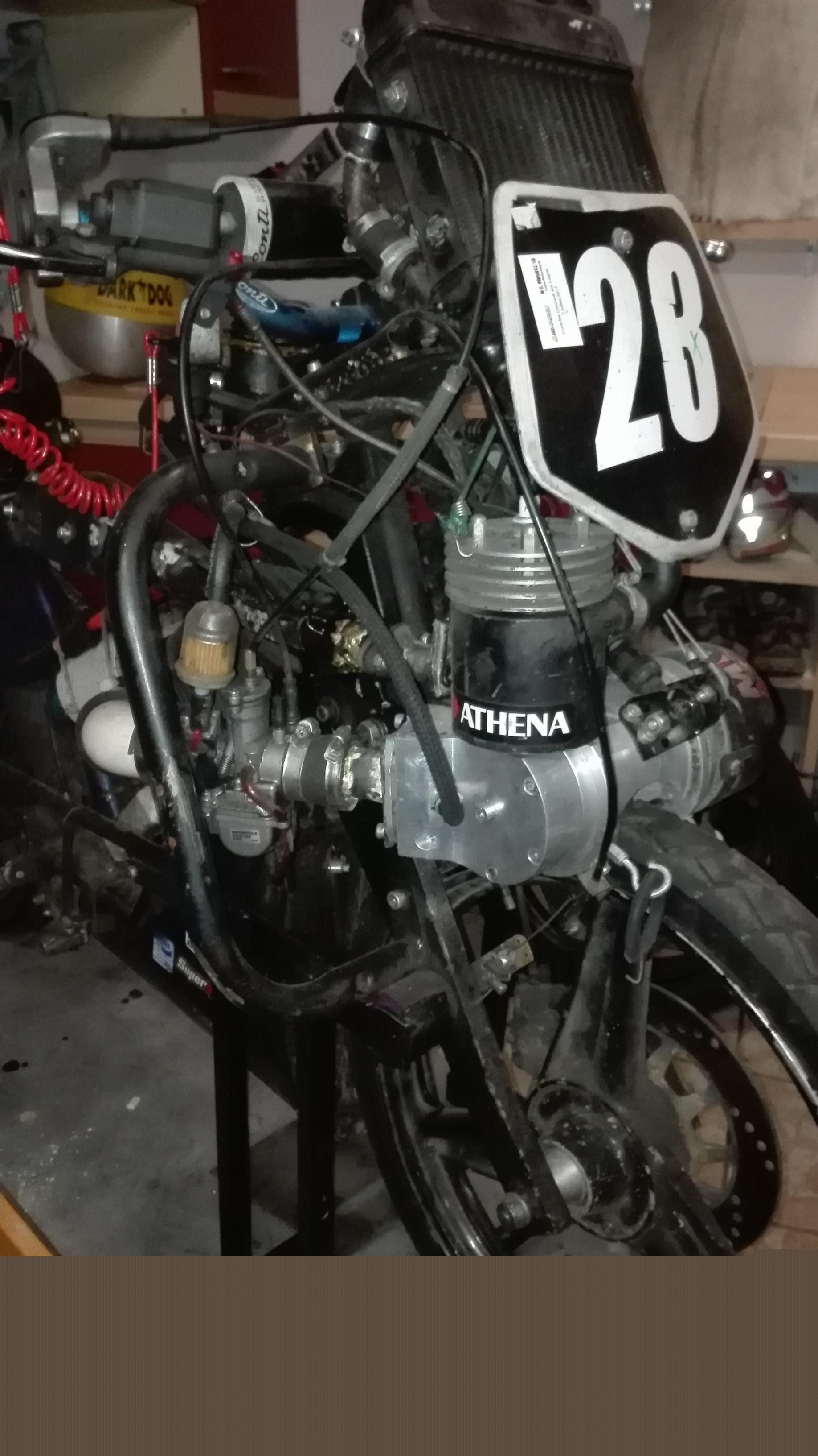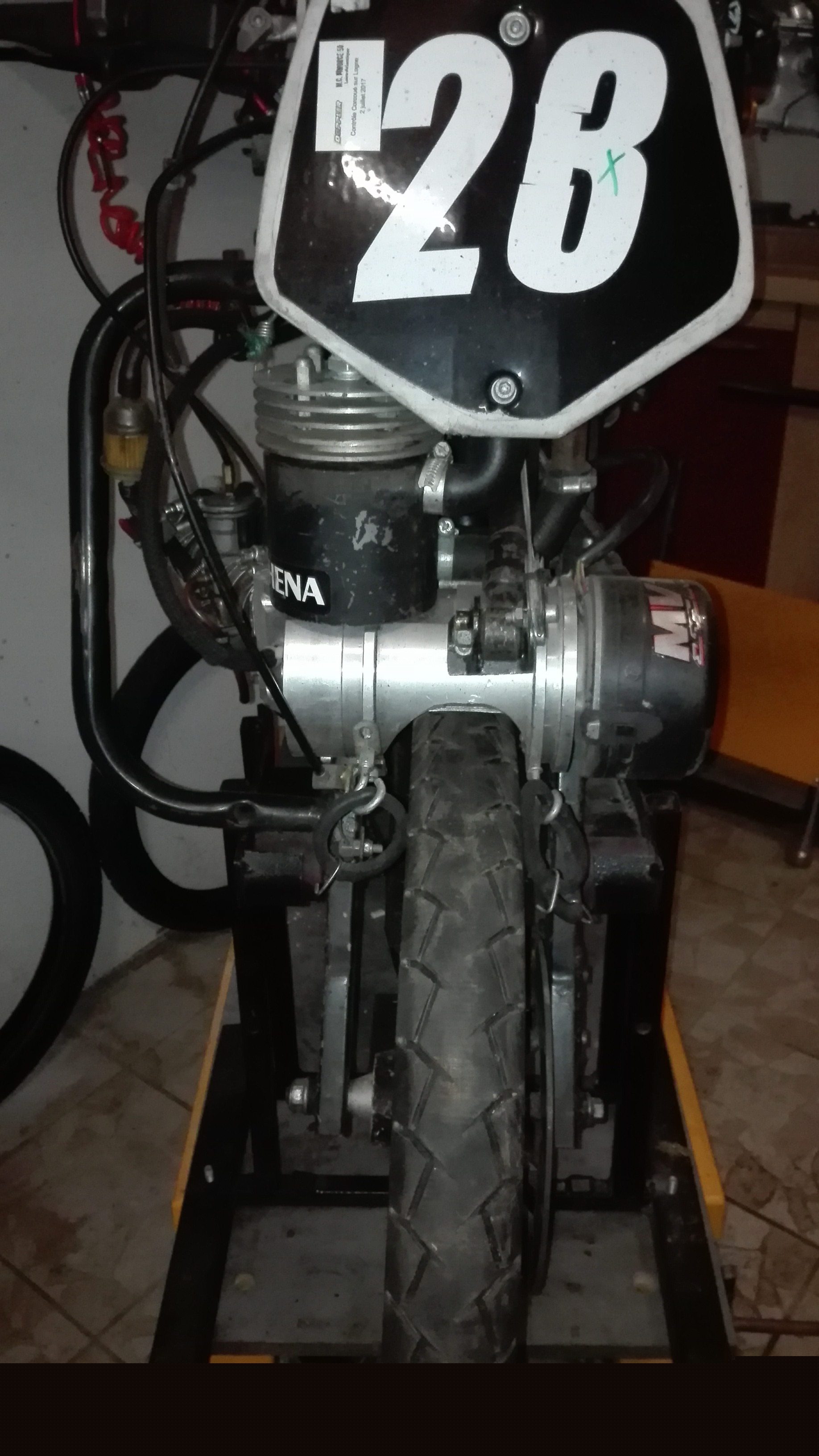Pour le moteur c'est un carter "chicane" avec un vilo "Pitou" et une admission type "wable". le montage du bas moteur est copié sur les chevillards je n'ai jamais eu de casse à ce niveau. Allumage mvt et carbu polini 24.