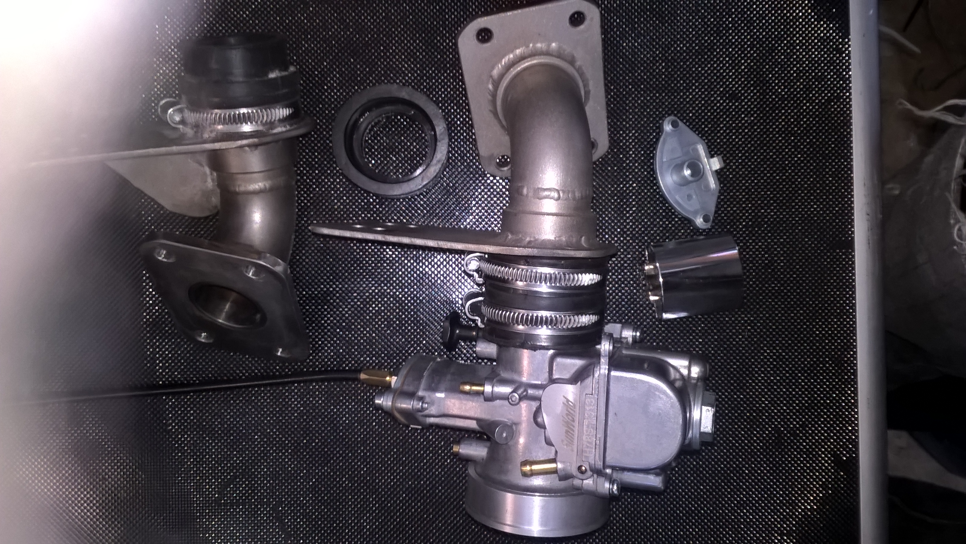 Vends lot : Carburateur 28 mm sunworld préparé (rouler 12 h ) avec boisseaux et couvercle de rechange neuf , et 2 pipes pour entraxe pour boite à clapet derbi avec manchons pour mettre le carburateur de 28 sunworld et manchon pour mettre d'autres carburateur type pwk .